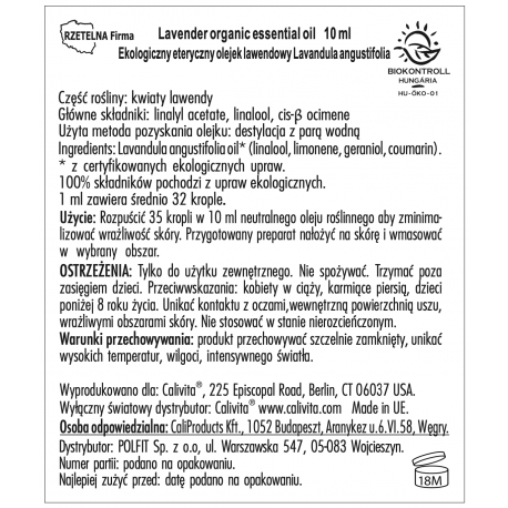 Kropla natury nowa rodzina produktów Calivita to w 100% czyste, ekologiczne olejki eteryczne, które oprócz pozytywnego wpływu na nastrój i samopoczucie oferują wiele korzyści zdrowotnych. Ekologiczny lawendowy olejek eteryczny pozyskany jest z kwiatów lawendy (Lawandula angustifolia) metodą z użyciem destylacji z parą wodną. Działa kojąco na ciało i umysł. Redukuje napięcia emocjonalne, uspokaja, odpręża, relaksuje, Korzystnie wpływa u osób mających problem z zaśnięciem, poprawia jakość snu. Działa na skórę antyseptycznie, wspomaga regenerację skóry m.in przy zadrapaniach, siniakach. Wspiera układ oddechowy. Pomocny jest także w przypadku osób zmagających się z migrenami. Olejki eteryczne są wolne od wszelkich zanieczyszczeń, syntetycznych substancji, sztucznych aromatów.